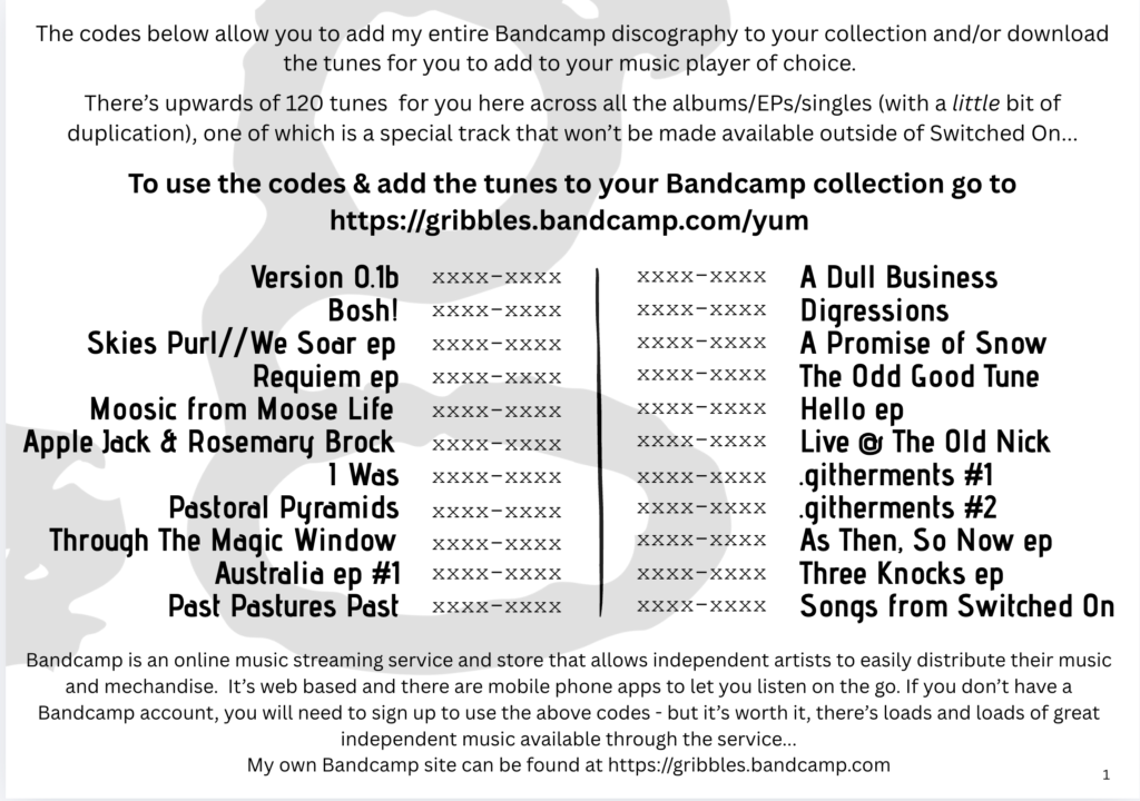 All you need to do is drop me a message on Bluesky, Mastodon or Bandcamp, wishing me a happy birthday and letting me know your email address. For the first 59 folk to do that, I’ll send you an image of one of the printed sheets that contains all the codes for everything from version0.1b though to Three Knocks e.p.
